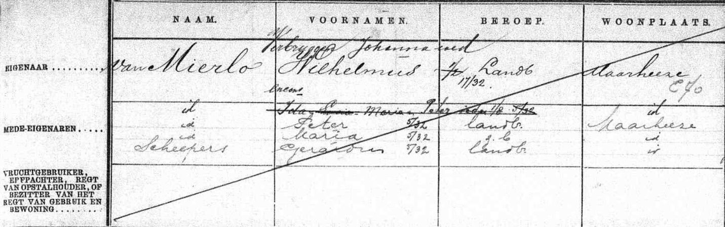 Na het overlijden van Antonius van Mierlo in 1934, en Johanna Verbruggen in 1942 staan zoon Peter Nicolaas en dochter Maria Antonia ieder voor ½ deel als eigenaars geregistreerd. Zij zijn de enige twee overlevende en in Maarheeze achtergebleven kinderen. Zij blijven beiden ongehuwd.