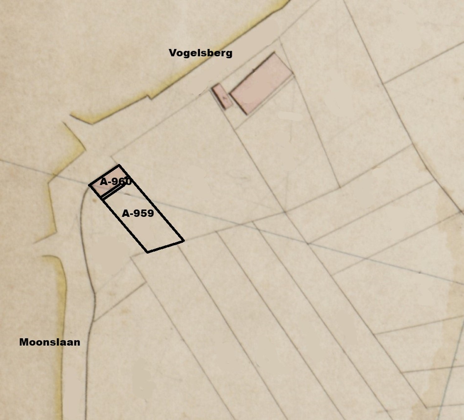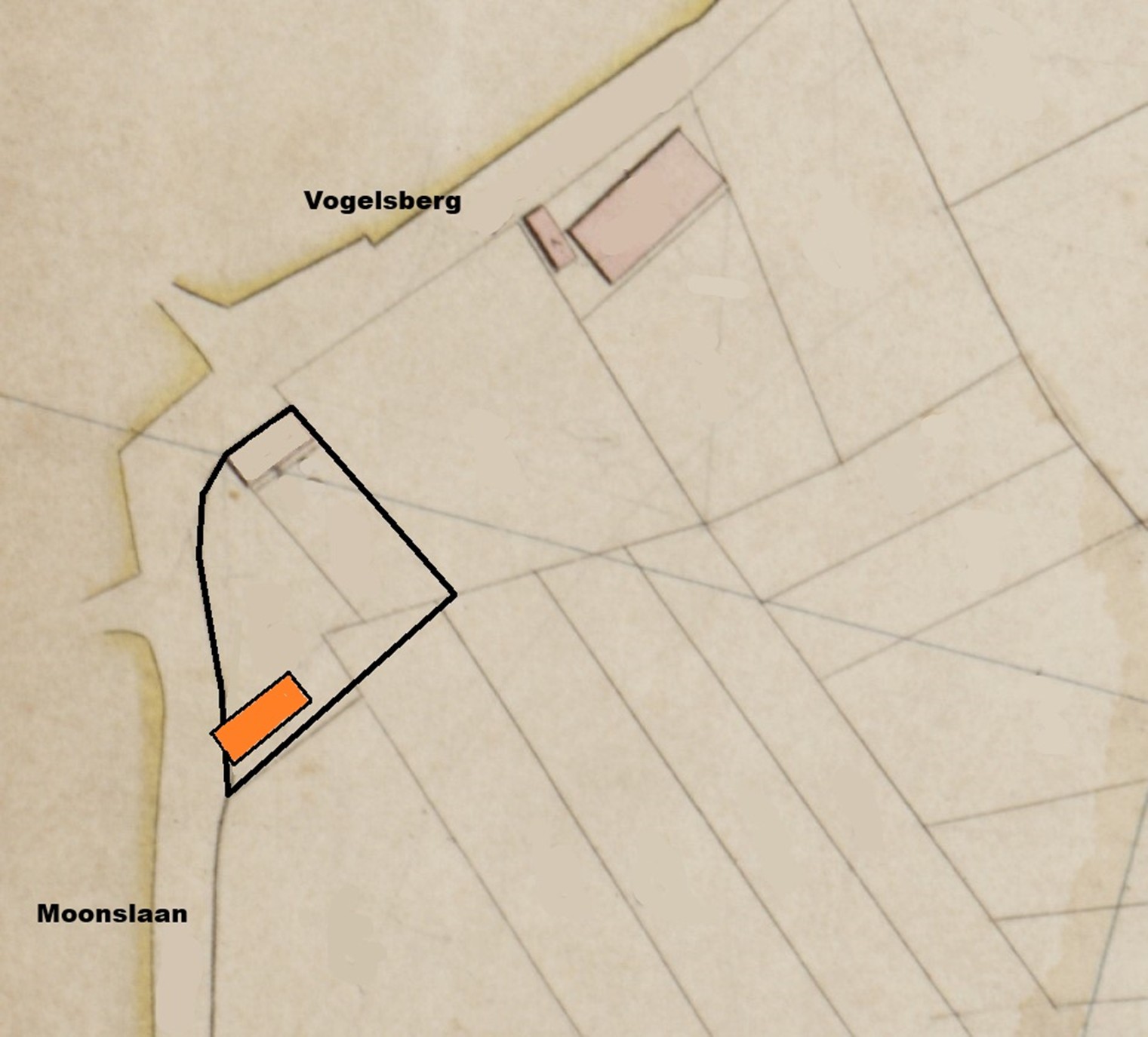 Met deze bouw en uitbreiding van grond ligt een helft aan de Vogelsberg, en een helft aan de Kijkakkers wat later Moonslaan wordt, te zien op onderstaand kaartje uit 1879.