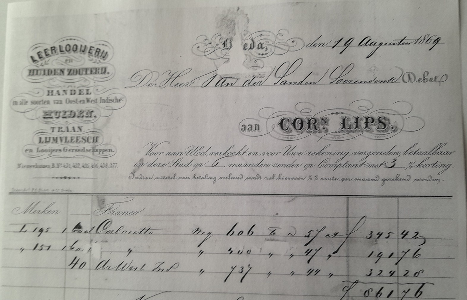 Onderstaand een voorbeeld van zijn correspondentie uit 1869 met de handelsfirma Lips.