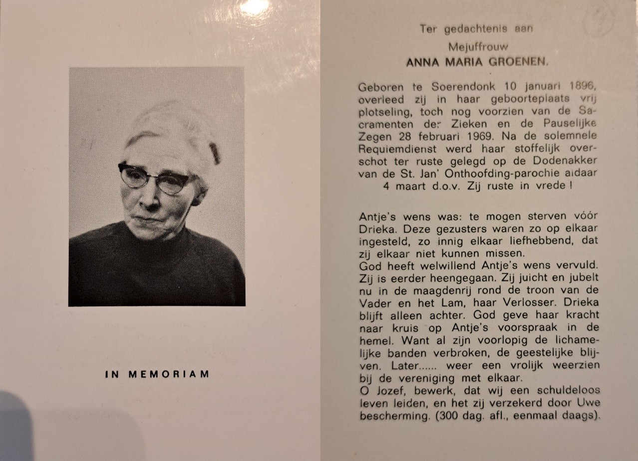Antje Groenen overlijdt op 28 februari 1969, 73 jaar. Drika Groenen overlijdt op 22 februarie 1975, 81 jaar.